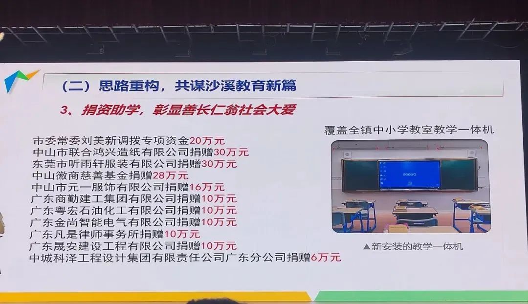 为推动沙溪教育走出低谷,近两年,沙溪镇党委镇政府直面困难,主动作为,广开门路,多方筹措,共破教育发展困局。在中山市委、市政府和市教体局高度重视和支持下,在热心企业捐资支持以及全镇师生团结一致共同努力下,沙溪教育面貌发生了翻天覆地的变化:总投入7000多万元的虎逊、云汉两间学校扩建工程顺利完工并投入使用,新增学位1800个;原落后破烂的16间中小学教育教学设施加以升级改造,校舍面积约1.2万㎡得到修缮;下泽小学改扩建工程有序推进,新增学位600个;全镇中小学课室实现教学一体机、智慧照明在全市率先全覆盖;沙溪中学、溪角中学与龙山中学实现集团化合作办学,教育均衡发展;全镇教师队伍充满活力,教学质量稳步提升,荣获国家、省、市级奖项2000余项,溪角中学重回市初中教学质量评价一等奖行列......