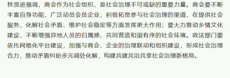 林贤进书记一行参观了商会办公场所,详细了解了安徽商会在党建会建、参与社会治理等方面的工作情况,随即在商会开展调研座谈。