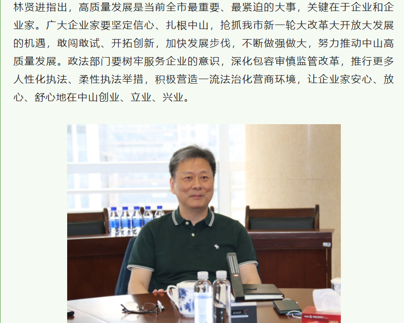 2023年3月7日,市委常委、政法委书记林贤进,市委政法委常务副书记李有林,市委政法委专职副书记梁小星,市工商联秘书长钟焕军等一行领导莅临我会调研指导。中山市安徽商会会长桑成敬,执行会长虞上海、言霆,常务副会长许勇,监事长罗金良,秘书长孙长征等商会企业家代表参与座谈。