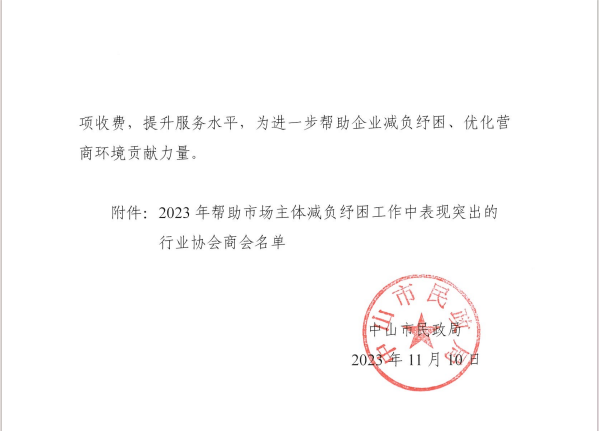 2023年11月10日,中山市民政局发出通报,对在助企减负纾困工作中表现突出的6家协会商会予以表扬,伟德官网电脑版名列其中。