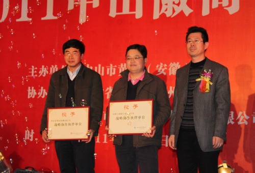 年会分两个阶段进行,第一阶段徐克伟会长总结2010年工作和布置2011年工作;对新增会员单位、法律维权单位颁发牌匾;表彰商会2010年突出贡献的11会员单位和优秀奖7个会员单位,并颁发奖牌;朱明照副会长代表获奖单位发表获奖感言,同时,徐克伟会长与工行中山分行刘同朋副行长现场签订了《全面合作框架协议》书,并互赠战略合作伙伴匾牌。最后民政局朱家俊科长致辞,他认为在辞旧迎新之际,中山黄山商会召开年会很有意义,有这么多领导、嘉宾、会友、乡友和各界朋友光临,展现了黄山商会的魅力和活力。他对徐会长所作的商会工作报告很赞同,不仅回顾过去还展望未来,既总结取得的成绩,又科学安排新一年工作,有总结才有提高,有计划才能发展,相信商会的前景是美好的。朱科长对获得荣誉的会员单位表示热烈祝贺!他希望获奖单位要戒骄戒躁,再创佳绩。同时希望商会在改革发展的新时期,面临着新的商机和挑战,要继续履行商会宗旨,不断传承徽商精神,弘扬徽商文化,打造新徽商精英团队,努力创新发展、为中山和安徽两地的社会建设和经济建设作出新的贡献,再创新业绩!并祝贺大家新春愉快、合家幸福、心想事成!