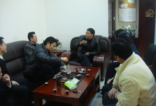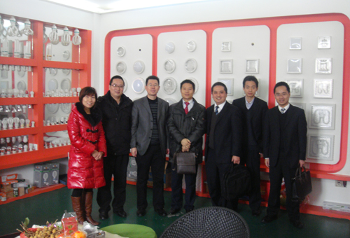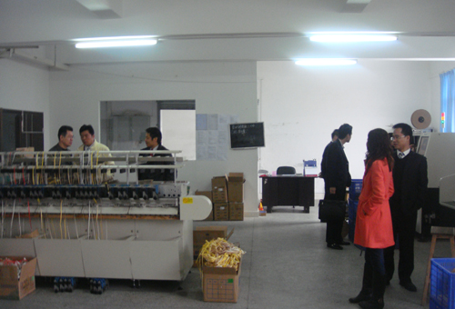 在常务副会长蒋富裕(中)、副会长沈围围、副秘书长杨进东陪同下走访远能光电照明电器厂。
