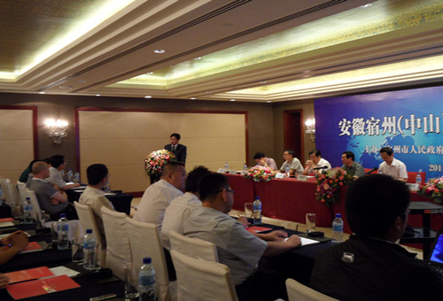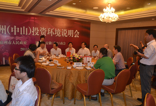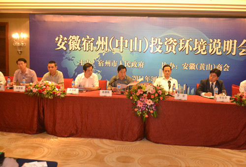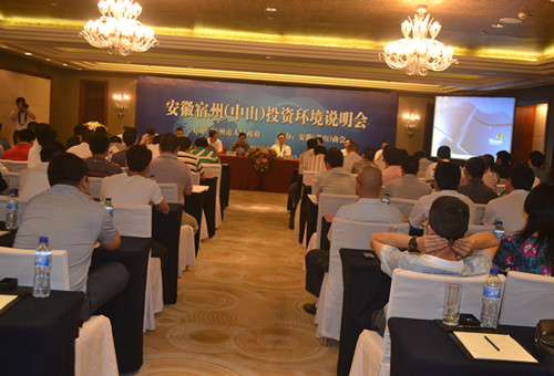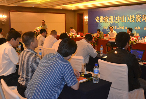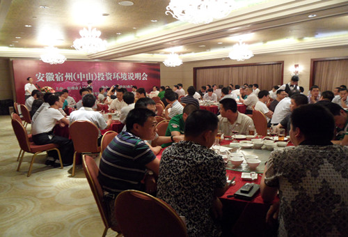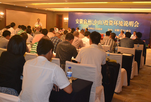 5月26日,安徽省宿州市政府主办,中山市黄山(安徽)商会协办的“安徽宿州(中山)投资环境说明会”,在中山市香格里拉大酒店举行。出席人员有中山市人民政府副秘书长岑宏开、中山市经信局副局长侯银辉、宿州市人民政府副市长罗宏、 宿州市政协副主席高德刚、宿州市经信委主任王汉武、宿州市经信委纪检组长王学华、宿州市轻纺协会会长贾成云、宿州市招商局副局长李从森、宿州市经信委办公室主任耿万及中山市黄山商会常务副会长高德富、欧元春、桑成敬、蒋道松、蒋富裕及柏荣奇等。商会共邀约80多位嘉宾出席, 为会议的成功举办打下了坚实的基础。