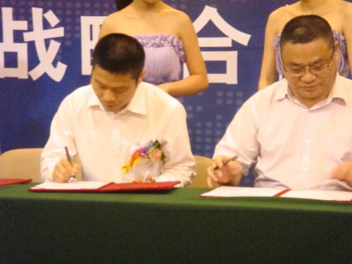 图/商会照明电器专业委员会主要负责人蒋富裕与环球家居董事长罗康民签约