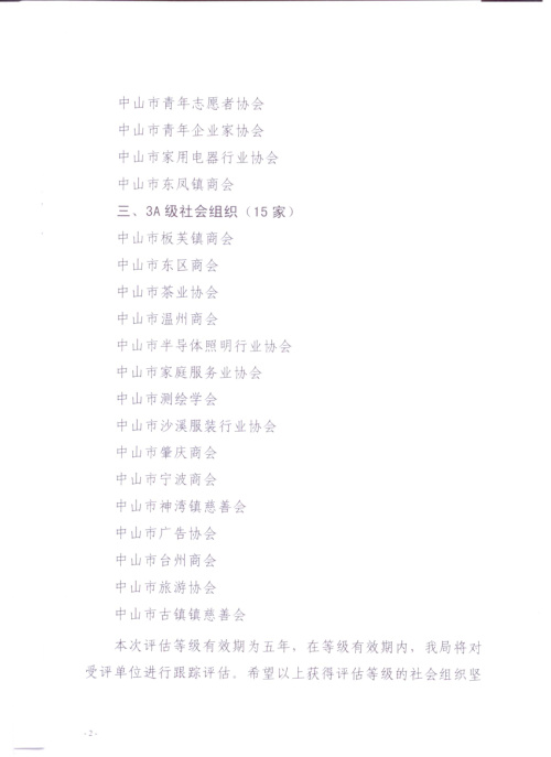 本次等级评估是中山市民政局根据《中山市社会组织评估实施办法》在2012年下半年开始启动,经过单位自评、评估专家小组考评、联席会议审核终评以及媒体公示等程序,历经半年多时间对29家申报社会组织等级评估的社会组织进行严格考评。获得3A以上等级的协会、商会共22家,其中中山市慈善总会等2家被评为“5A级社会组织”,伟德官网电脑版等5家被评为“4A级社会组织”,中山市板芙商会等15家被评为“3A级社会组织”。