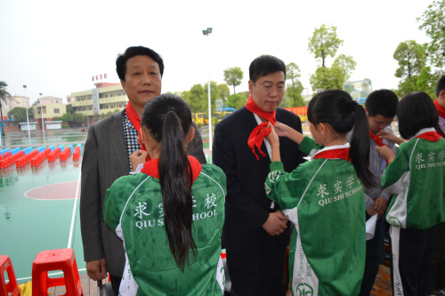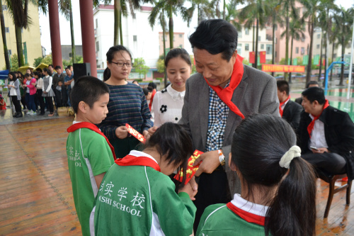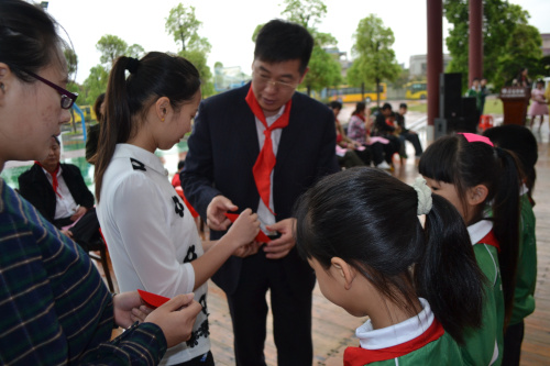 图/孩子们为商会志愿者们举行戴红领巾仪式