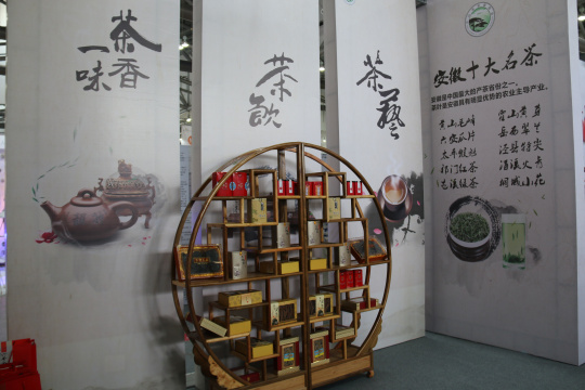“马头墙”下的展厅,笔墨纸砚、香茶、美酒、药材、奇石一字排开。展厅正门,LED屏幕正在播放大美安徽宣传片,吸引了游览者驻足观看。安徽馆采取图片与实物展出相结合、书法名家表演推介我安徽省具有代表性的特产与徽文化。