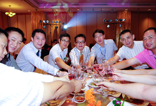 与凯茵新城总经理孙杨杰(右一)、销售部副总监罗锟(右二)晚宴上敬酒