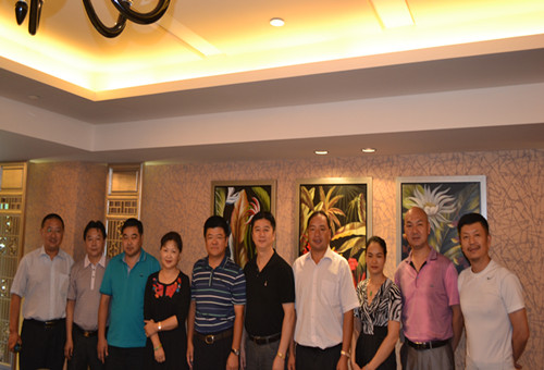 图/黄梅戏“五朵金花”之一吴亚玲(左4)、安徽省黄梅戏剧院院长蒋建国(左6)与商会成员合影
