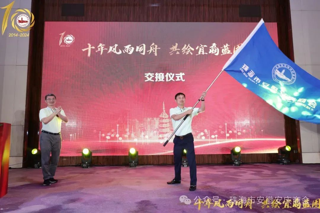 珠海市安徽安庆商会近期举办第四届理监事就职典礼,祝贺我会丁宪明理事当选会长,图为第三届会长何晓东与第四届会长丁宪明(右一)完成会旗交接。