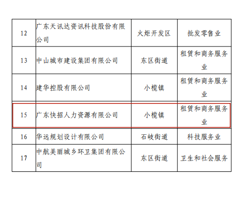 热烈祝贺广东快招人力成功被认定为中山市总部企业!这是对快招人力卓越实力和行业影响力的高度认可,标志着公司在人力资源服务领域的领先地位。期待快招人力继续引领行业发展,创造更多辉煌成就!