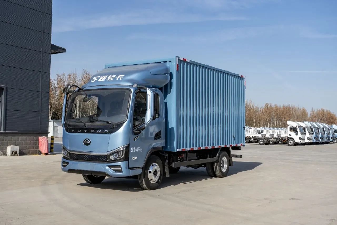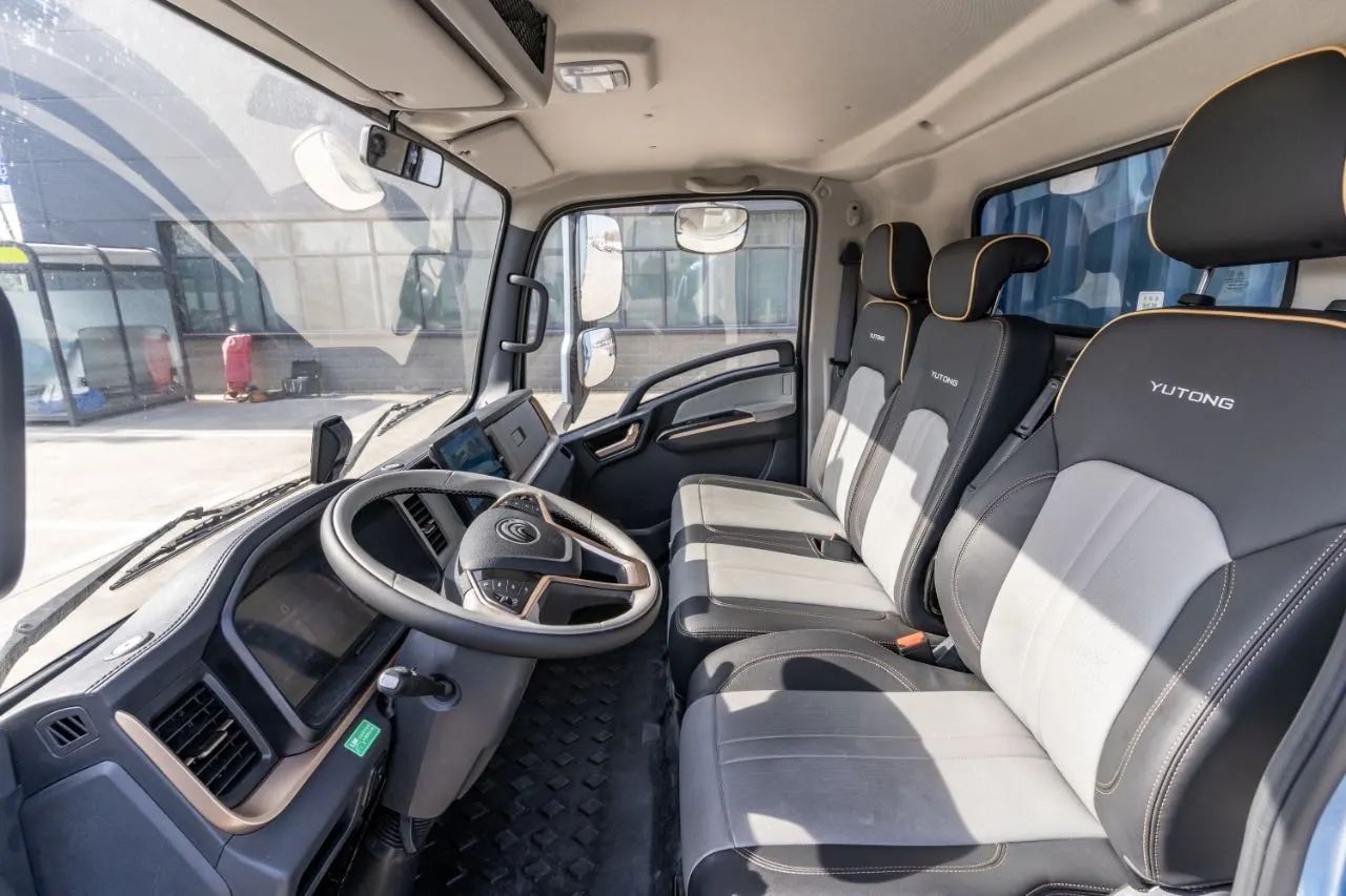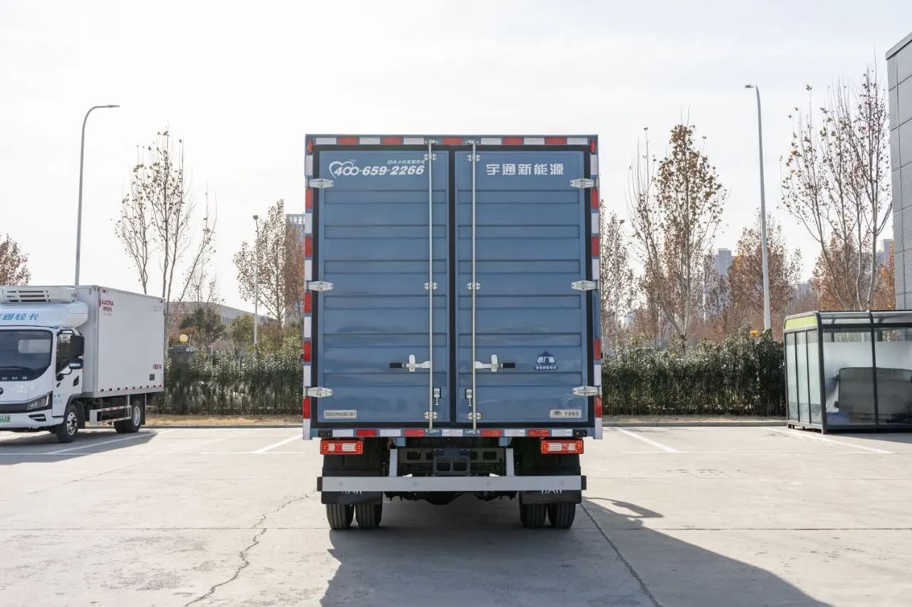 快递、快运、商超配送,零担,冷链配送等物流配送,覆盖城市物流、城际物流等多种场景。①依托宇通专属睿控技术及整车集成能力,实现三电高效集成及整车轻量化(注:同等工况包括整车尺寸、车速、载重、道路、环境等)集成化设计:通过软硬件协同,优化整车控制策略,实现整车高效集成,续航里程不断升级。轻量化设计:通过采用高能量密度深澜电池,以及高强度轻量化货厢等轻量化材料,在降重的同时保证车辆的承载力。低风阻设计:整车流线化设计,实现风阻系数降低5%,能耗降低2%。低滚阻设计:对轮胎滚阻系数进行优化,滚阻系数降低2~5%,能耗降低2%。全新一代高能深澜电池,能量密度最高达175Wh/kg,电池系统荣获国家科技进步二等奖。采用高效扁线电机,电机最高效率≥97.5%,荣获中国首张电动汽车驱动电机系统高效占比最高等级A级认证证书。全新一代高效轻量化集成式电驱桥,采用高速简级传动技术,传动效率提高3%以上。③智能高效热管理系统,让电池工作环境更“舒适安全”液冷系统,40℃高温环境高速运行后,充电时间相比自然冷却电池充电时间缩短10~20min;液热系统,冬季电池升温快,提高充电速度,流入电池包的液体温度可实时监控,热电分离更安全。SOC精度性≥97%,不虚标,有底气,减少车辆抛锚概率,降低里程焦虑。三电行业最高防护等级,电池防护等级IP68&IP6K9K,采用高耐火阻燃材料,可承受1300℃火烧30min不烧穿;电池2m水深浸泡72h可正常使用;中性盐雾试验720h, 电池8年不生锈。电池离地高度最大达530mm,并对电池进行装甲防护,避免石子飞溅磕碰。相同条件下正面碰撞后,驾驶员受到方向盘水平冲击力降低33.17%,生存空间增加30mm,大幅度提升车祸后驾驶员生存几率。匹配安全预警(DMS疲劳驾驶提醒、车道偏离预警、前碰预警)+主动安全控制功能(AEB自动紧急制动、LKA车道保持),行车更安全。行车制动器采用前盘后鼓,标配电缓速制动+气刹制动,制动响应快,较行业气刹短2米。气刹+ autohold(临时停车)+EPB电子驻车,具备驻车自动接管、开门自动驻车、下电自动驻车、起步自动释放等附加功能,提升用车安全,操作较方便。