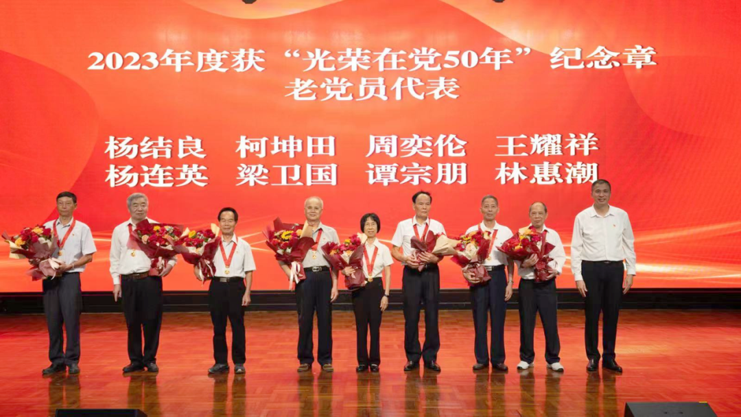 “光荣在党50年”,是激励党员干部传承优良传统、矢志奋勇前行的强大力量。老党员是我们党光辉历程的参与者、奋斗者、见证者,是党和国家的宝贵财富。党工委书记周俊峰为杨结良、柯坤田、周奕伦、王耀祥、杨连英、梁卫国、谭宗朋、林惠潮八位老党员代表颁授纪念章,引导广大党员干部牢记初心使命,赓续光荣传统,传承精神谱系,在推动“百千万工程”中奋勇争先,为加快推进现代化建设贡献力量。
