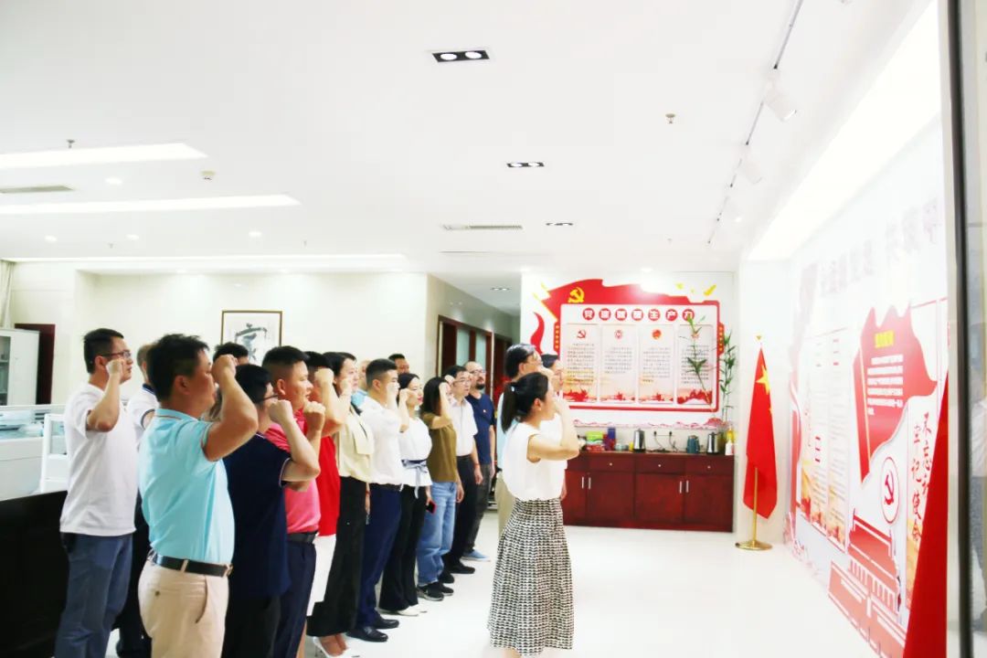 全体党员面向党旗,高举右手,胸前党徽闪耀,重温入党誓词。党旗鲜红依旧,入党誓词掷地有声、铿锵有力:“我志愿加入中国共产党,拥护党的纲领,遵守党的章程……”。